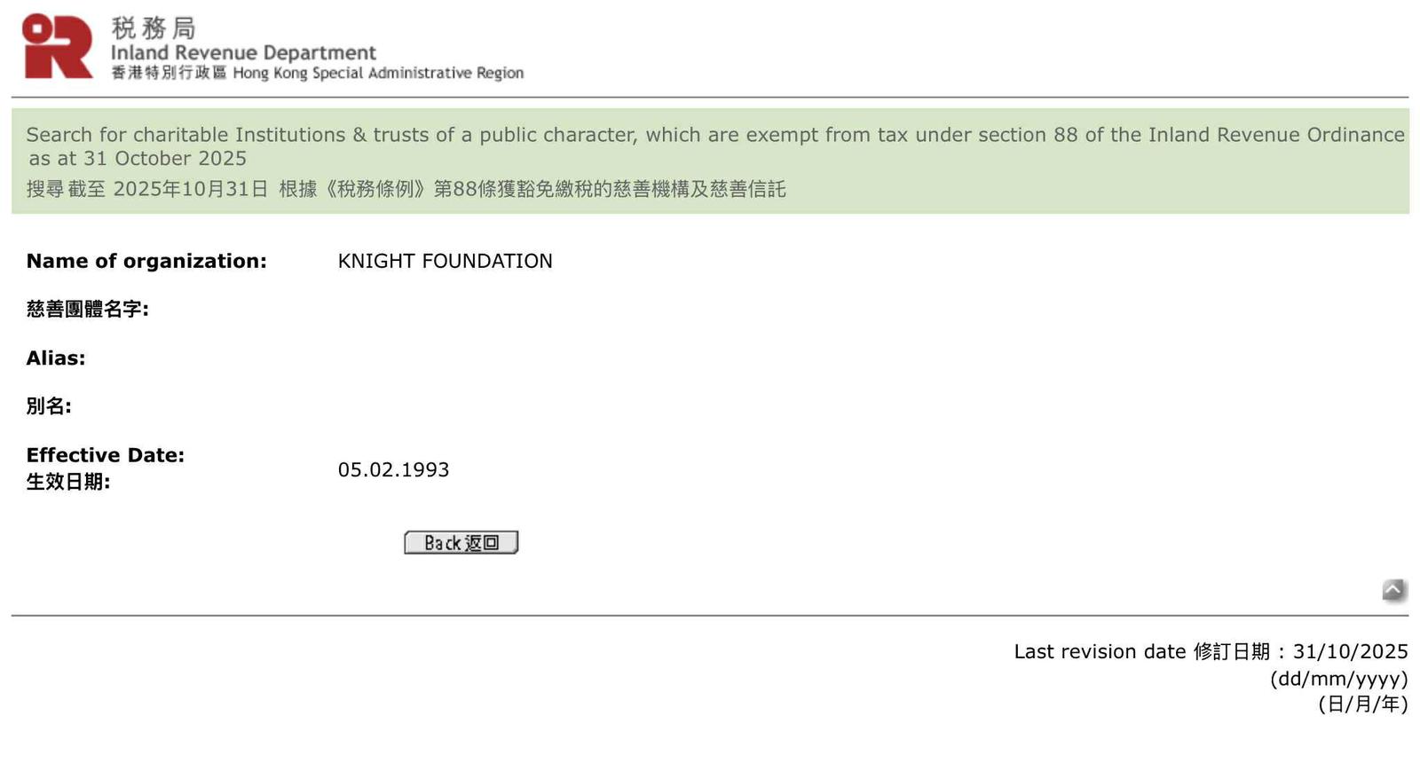 Knight Foundation has been a registered charity in Hong Kong since 1993 (IRD : Charitable Donations and Tax-Exempt Charities).